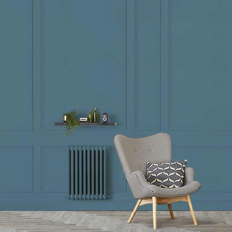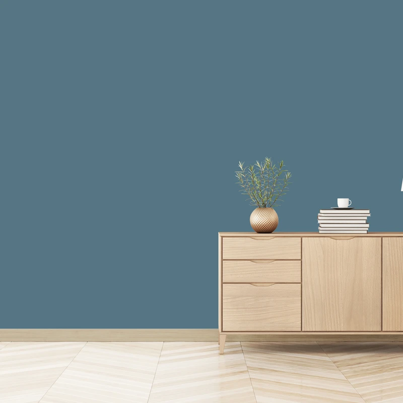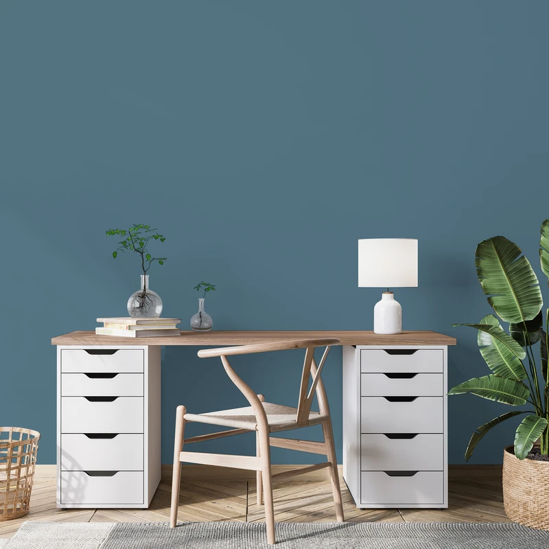 Un bleu moyen grisé, il enveloppe avec calme et quiétude les espaces.