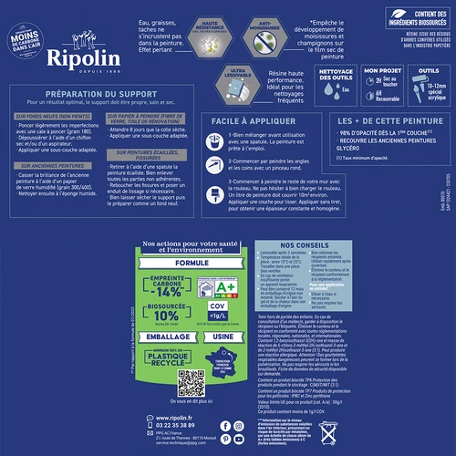 Ce produit est spécialement conçu pour vos pièces humides : cuisine, salle de bain et buanderie. Grâce à la technologie 'effet perlant', l'eau ne pénètre pas le support mais ruisselle. Cette peinture est très lessivable.