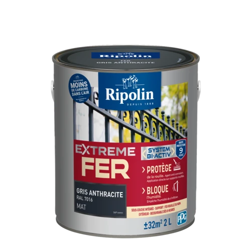 La peinture Ripolin EXTREME FER s'applique directement sur support même rouillé. Elle bloque l'humidité et protège de la rouille. Sa formule allie résistance aux agressions climatiques et protection durable.
