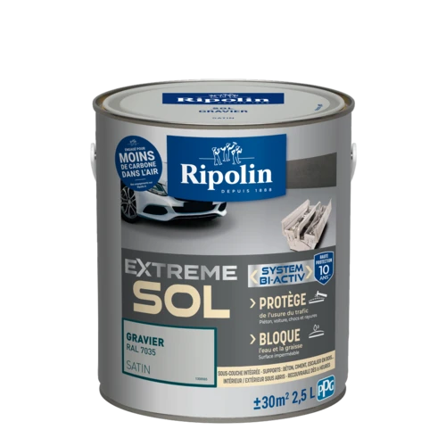 La peinture Ripolin EXTREME SOL assure une haute résistance aux passages piétons et des pneus chauds, ainsi qu’aux tâches, aux rayures et aux chocs. Grâce à son agent nivelant l'application est facile pour une fintion satin tendue très esthétique.